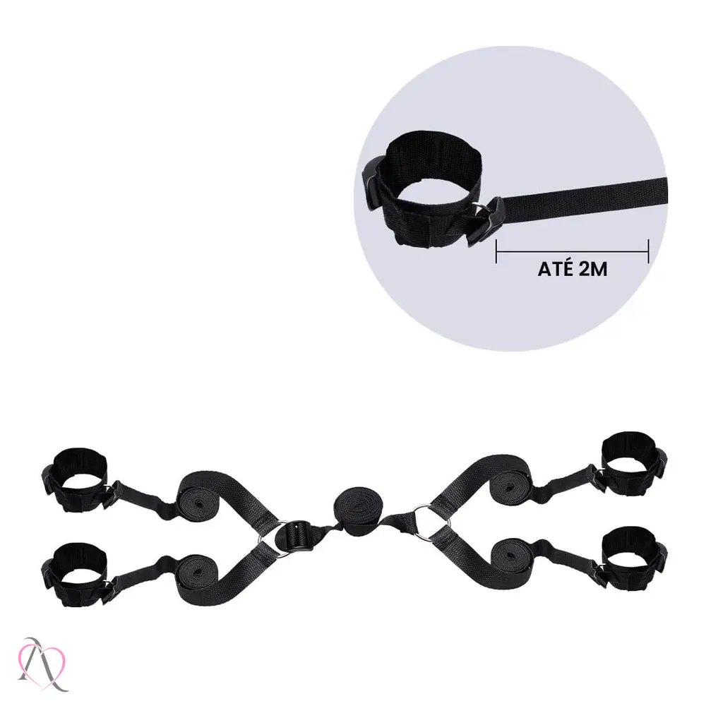 O conjunto conta com algemas para os pulsos e tornozeleiras para os tornozelos, criando um ambiente de restrição na cama.