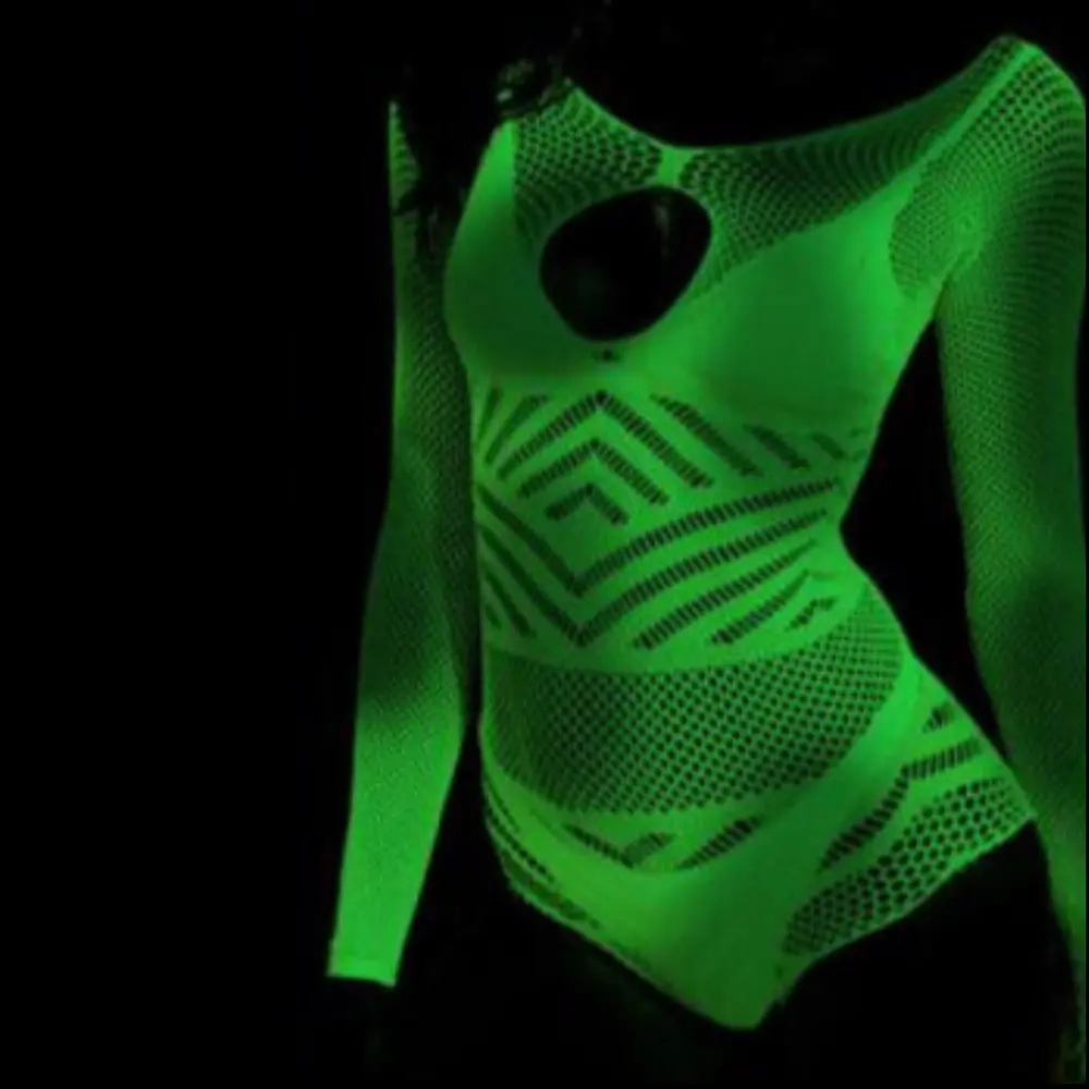O grande diferencial está no efeito luminoso: quando exposto à luz forte ou luz negra, o body ganha brilho e se transforma, chamando atenção e deixando o visual ainda mais marcante.