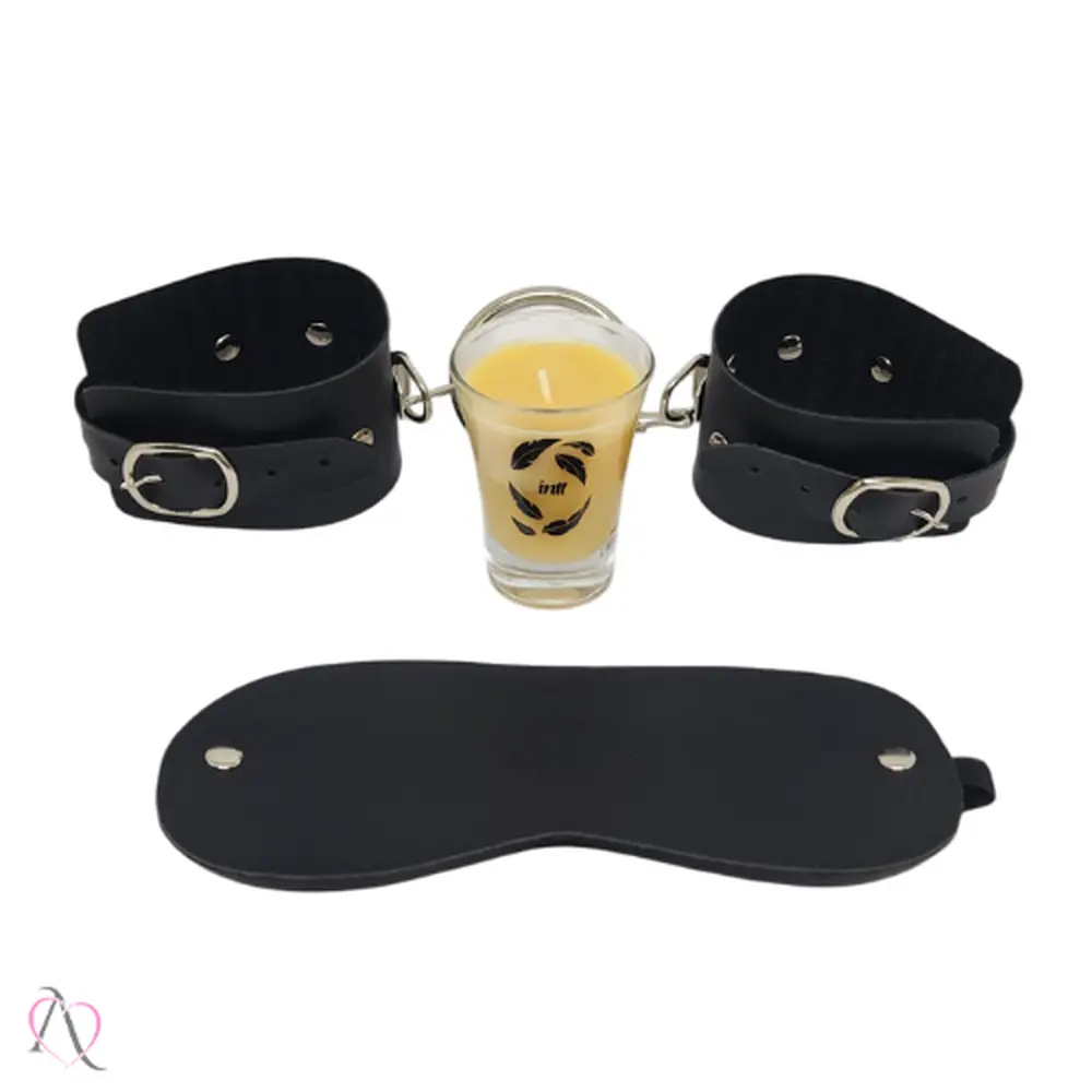 Kit Novas Experiências - 1 Vela Beijável de Chocolate, 1 Algema de Couro e 1 Venda Tapa Olho
