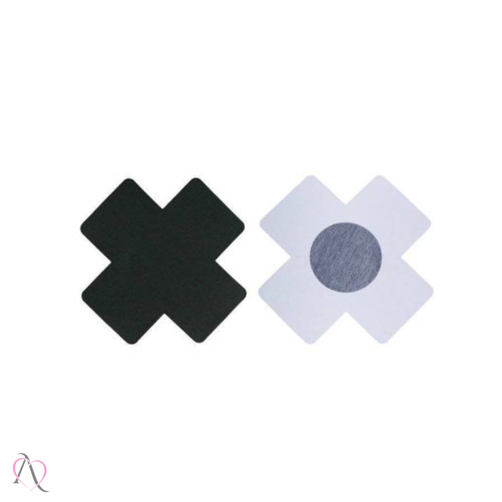Contém: 1 par de tapa mamilos em formato de X preto.