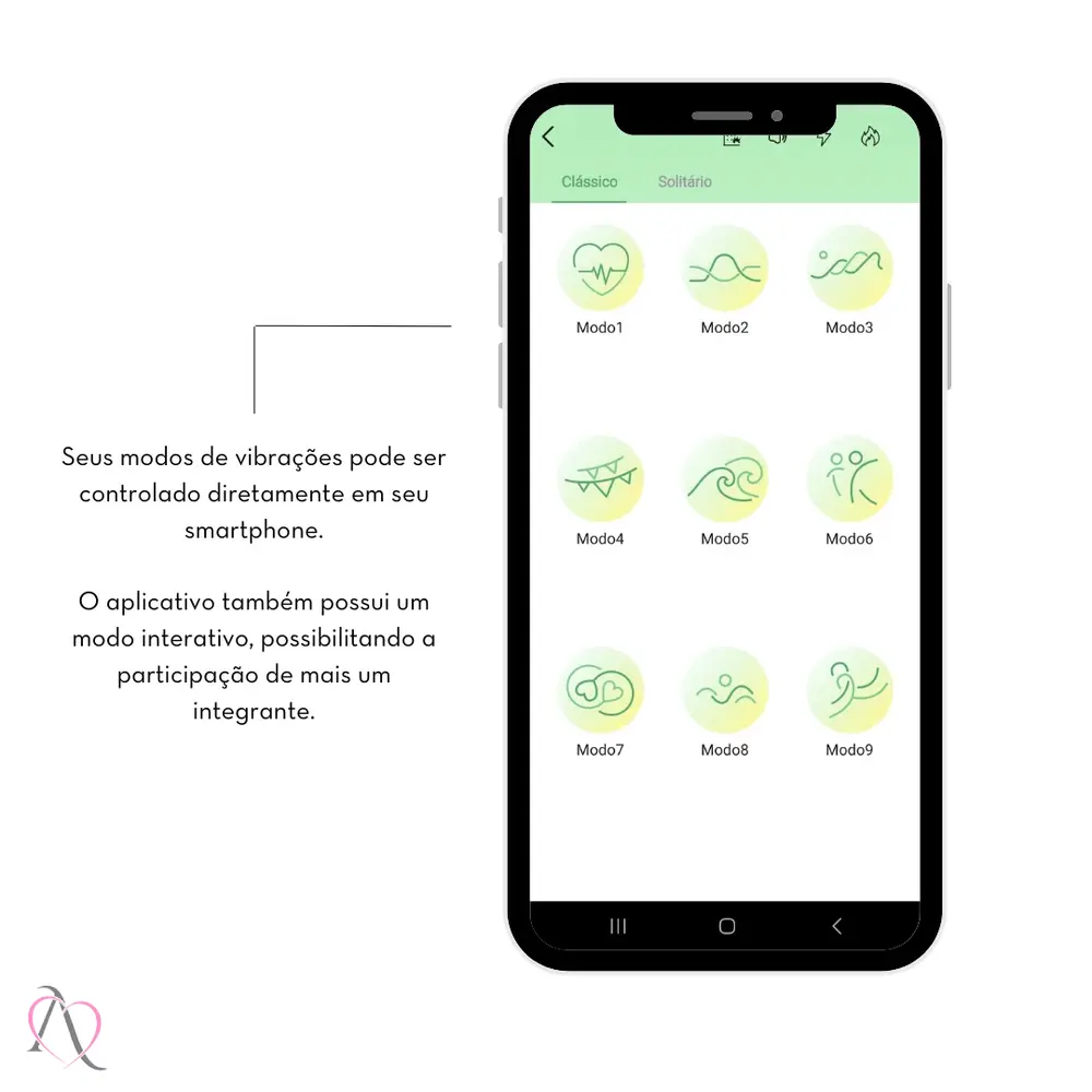 O grande diferencial? Você pode controlar os 9 modos de vibração direto pelo aplicativo no celular, seja para explorar sozinha, em segredo, ou convidar seu parceiro(a) para brincar com o poder nas mãos (de qualquer lugar do mundo).